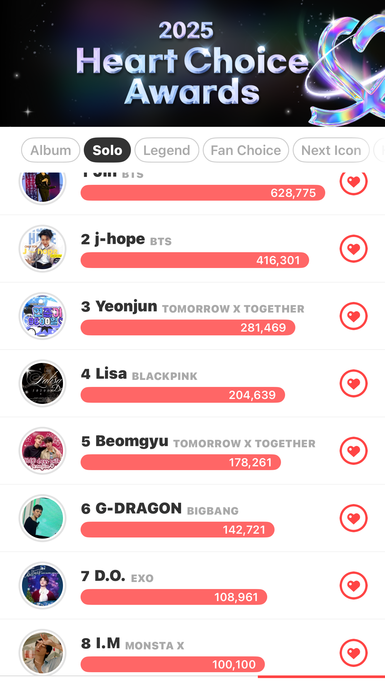 Votes tallied until 23:30(KST) every day.The overall rankings can be found in the app.