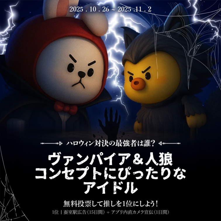 ー10月20日時点で個人名誉の殿堂ランキングTop100に入っており、MVやパフォーマンス映像(カバーステージを含む)でヴァンパイアまたは人狼コンセプトとして登場した、もしくはヴァンパイア/人狼をテーマにした楽曲を持つアイドルが本イベントの候補として選ばれます。