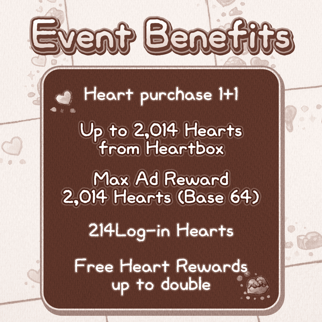 - During the event period, you will have 64hearts instead of 50 hearts!